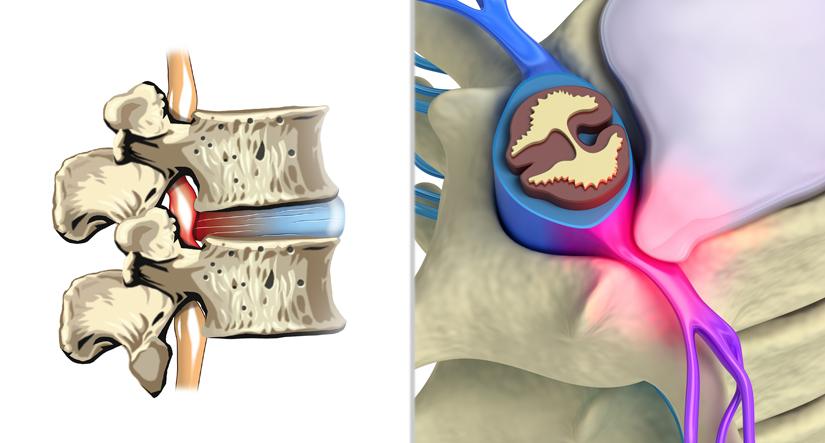 Common symptoms of a herniated lumbar disc is immediate sharp pain in the lower back, potentially travelling down the leg, that makes movement almost impossible. This pain is often worsened by any type of forward bending (putting on your shoes or socks, getting out of bed in the morning), and can be aggravated by sneezing or coughing.